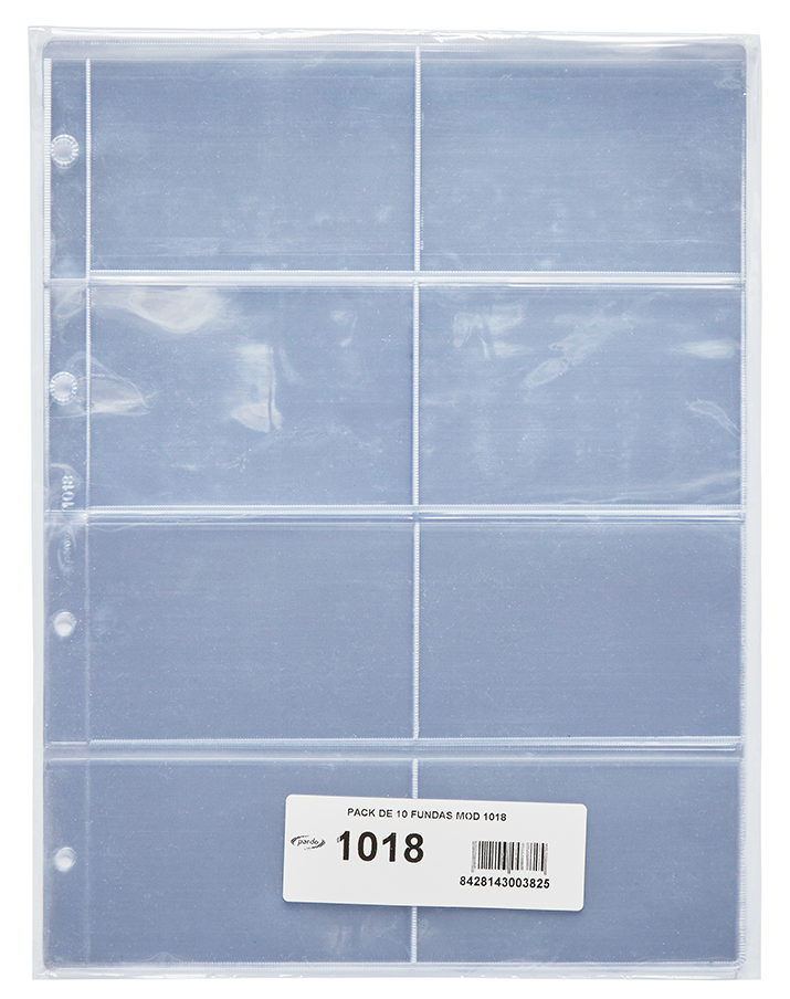 Funda trasnparende con medidas de 238x315mm y ocho huecos horizontales. Para colecciones diversas.